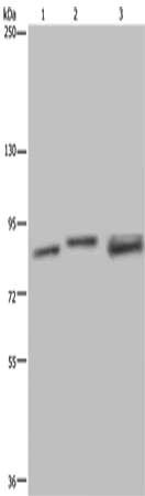 Gel: 6%SDS-PAGE, Lysate: 40 μg, Lane 1-3: Jurkat cells, A172 cells, mouse brain tissue, Primary antibody: CSB-PA225804(NR3C1 Antibody) at dilution 1/300, Secondary antibody: Goat anti rabbit IgG at 1/8000 dilution, Exposure time: 2 minutes