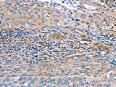 The image on the left is immunohistochemistry of paraffin-embedded Human cervical cancer tissue using CSB-PA278214(NRG4 Antibody) at dilution 1/60, on the right is treated with fusion protein. (Original magnification: ×200)