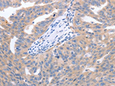 The image on the left is immunohistochemistry of paraffin-embedded Human ovarian cancer tissue using CSB-PA219834(NRTN Antibody) at dilution 1/40, on the right is treated with synthetic peptide. (Original magnification: ×200)