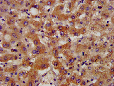 IHC image of CSB-PA618994LA01HU diluted at 1:400 and staining in paraffin-embedded human liver tissue performed on a Leica BondTM system. After dewaxing and hydration, antigen retrieval was mediated by high pressure in a citrate buffer (pH 6.0). Section was blocked with 10% normal goat serum 30min at RT. Then primary antibody (1% BSA) was incubated at 4°C overnight. The primary is detected by a biotinylated secondary antibody and visualized using an HRP conjugated SP system.
