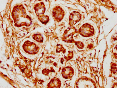 IHC image of CSB-PA839345LA01HU diluted at 1:300 and staining in paraffin-embedded human breast cancer performed on a Leica BondTM system. After dewaxing and hydration, antigen retrieval was mediated by high pressure in a citrate buffer (pH 6.0). Section was blocked with 10% normal goat serum 30min at RT. Then primary antibody (1% BSA) was incubated at 4°C overnight. The primary is detected by a biotinylated secondary antibody and visualized using an HRP conjugated SP system.