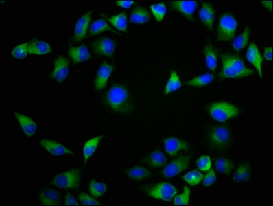 Immunofluorescence staining of Hela cells with CSB-PA016138LA01HU at 1:133, counter-stained with DAPI. The cells were fixed in 4% formaldehyde, permeabilized using 0.2% Triton X-100 and blocked in 10% normal Goat Serum. The cells were then incubated with the antibody overnight at 4°C. The secondary antibody was Alexa Fluor 488-congugated AffiniPure Goat Anti-Rabbit IgG(H+L).