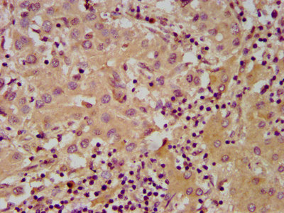 IHC image of CSB-PA891535LA01HU diluted at 1:600 and staining in paraffin-embedded human liver cancer performed on a Leica BondTM system. After dewaxing and hydration, antigen retrieval was mediated by high pressure in a citrate buffer (pH 6.0). Section was blocked with 10% normal goat serum 30min at RT. Then primary antibody (1% BSA) was incubated at 4°C overnight. The primary is detected by a biotinylated secondary antibody and visualized using an HRP conjugated SP system.