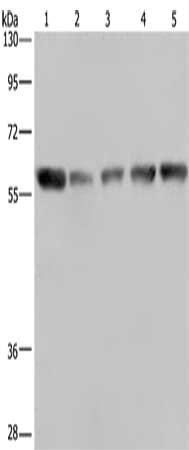 Gel: 8%SDS-PAGE, Lysate: 40 μg, Lane 1-5: Hela cells, human brain malignant glioma tissue, NIH/3T3 cells, PC3 cells, A549 cells, Primary antibody: CSB-PA255769(NUP62 Antibody) at dilution 1/300, Secondary antibody: Goat anti rabbit IgG at 1/8000 dilution, Exposure time: 5 seconds