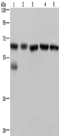 Gel: 8%SDS-PAGE, Lysate: 40 μg, Lane 1-5: Jurkat cells, human brain malignant glioma tissue, PC3 cells, K562 cells, A549 cells, Primary antibody: CSB-PA041313(NUP62 Antibody) at dilution 1/300, Secondary antibody: Goat anti rabbit IgG at 1/8000 dilution, Exposure time: 5 seconds