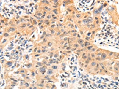 The image on the left is immunohistochemistry of paraffin-embedded Human lung cancer tissue using CSB-PA190654(OCLN Antibody) at dilution 1/10, on the right is treated with fusion protein. (Original magnification: ×200)