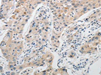 The image on the left is immunohistochemistry of paraffin-embedded Human lung cancer tissue using CSB-PA385632(OCLN Antibody) at dilution 1/10, on the right is treated with fusion protein. (Original magnification: ×200)
