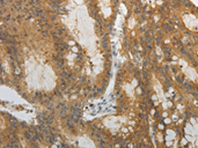 The image on the left is immunohistochemistry of paraffin-embedded Human colon cancer tissue using CSB-PA385632(OCLN Antibody) at dilution 1/10, on the right is treated with fusion protein. (Original magnification: ×200)