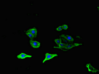 Immunofluorescent analysis of HepG2 cells using CSB-PA740917LA01HU at dilution of 1:100 and Alexa Fluor 488-congugated AffiniPure Goat Anti-Rabbit IgG(H+L)
