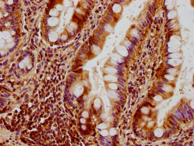 IHC image of CSB-PA016340HA01HU diluted at 1:300 and staining in paraffin-embedded human small intestine tissue performed on a Leica BondTM system. After dewaxing and hydration, antigen retrieval was mediated by high pressure in a citrate buffer (pH 6.0). Section was blocked with 10% normal goat serum 30min at RT. Then primary antibody (1% BSA) was incubated at 4°C overnight. The primary is detected by a biotinylated secondary antibody and visualized using an HRP conjugated SP system.