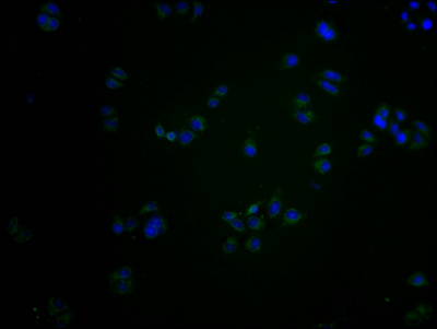 Immunofluorescence staining of Hela cells with CSB-PA873623PA01HU at 1:200, counter-stained with DAPI. The cells were fixed in 4% formaldehyde and blocked in 10% normal Goat Serum. The cells were then incubated with the antibody overnight at 4°C. The secondary antibody was Alexa Fluor 488-congugated AffiniPure Goat Anti-Rabbit IgG(H+L).