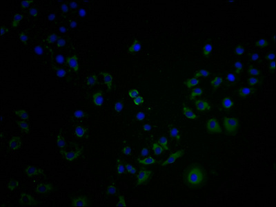 Immunofluorescence staining of A549 cells with CSB-PA836757OA01HU at 1:100, counter-stained with DAPI. The cells were fixed in 4% formaldehyde and blocked in 10% normal Goat Serum. The cells were then incubated with the antibody overnight at 4°C. The secondary antibody was Alexa Fluor 488-congugated AffiniPure Goat Anti-Rabbit IgG(H+L).