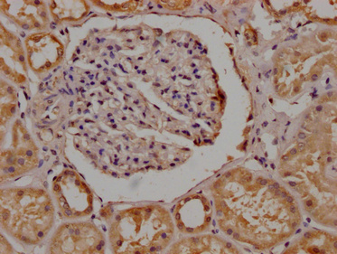 IHC image of CSB-PA836757OA01HU diluted at 1:200 and staining in paraffin-embedded human kidney tissue performed on a Leica BondTM system. After dewaxing and hydration, antigen retrieval was mediated by high pressure in a citrate buffer (pH 6.0). Section was blocked with 10% normal goat serum 30min at RT. Then primary antibody (1% BSA) was incubated at 4°C overnight. The primary is detected by a Goat anti-rabbit polymer IgG labeled by HRP and visualized using 0.05% DAB.