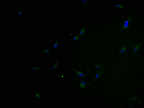 Immunofluorescence staining of Hela cells with CSB-PA822807PA01HU at 1:100, counter-stained with DAPI. The cells were blocked in 10% normal Goat Serum and incubated with the antibody overnight at 4°C. The secondary antibody was Alexa Fluor 488-congugated AffiniPure Goat Anti-Rabbit IgG(H+L).