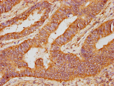 IHC image of CSB-PA09694A0Rb diluted at 1:90 and staining in paraffin-embedded human colon cancer performed on a Leica BondTM system. After dewaxing and hydration, antigen retrieval was mediated by high pressure in a citrate buffer (pH 6.0). Section was blocked with 10% normal goat serum 30min at RT. Then primary antibody (1% BSA) was incubated at 4°C overnight. The primary is detected by a biotinylated secondary antibody and visualized using an HRP conjugated SP system.