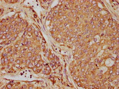 IHC image of CSB-PA09694A0Rb diluted at 1:90 and staining in paraffin-embedded human liver cancer performed on a Leica BondTM system. After dewaxing and hydration, antigen retrieval was mediated by high pressure in a citrate buffer (pH 6.0). Section was blocked with 10% normal goat serum 30min at RT. Then primary antibody (1% BSA) was incubated at 4°C overnight. The primary is detected by a biotinylated secondary antibody and visualized using an HRP conjugated SP system.