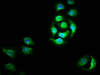 Immunofluorescence staining of A549 cells with CSB-PA850298LA01HU at 1:100, counter-stained with DAPI. The cells were fixed in 4% formaldehyde, permeabilized using 0.2% Triton X-100 and blocked in 10% normal Goat Serum. The cells were then incubated with the antibody overnight at 4°C. The secondary antibody was Alexa Fluor 488-congugated AffiniPure Goat Anti-Rabbit IgG(H+L).