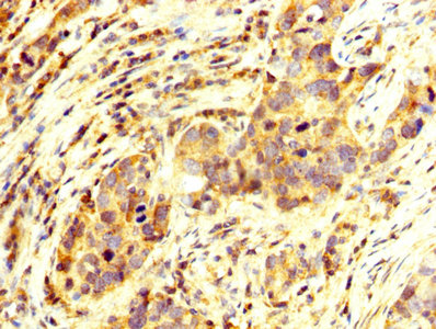 IHC image of CSB-PA017299LA01HU diluted at 1:250 and staining in paraffin-embedded human pancreatic cancer performed on a Leica BondTM system. After dewaxing and hydration, antigen retrieval was mediated by high pressure in a citrate buffer (pH 6.0). Section was blocked with 10% normal goat serum 30min at RT. Then primary antibody (1% BSA) was incubated at 4°C overnight. The primary is detected by a biotinylated secondary antibody and visualized using an HRP conjugated SP system.