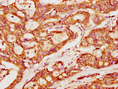 IHC image of CSB-PA890765EA01HU diluted at 1:400 and staining in paraffin-embedded human colon cancer performed on a Leica BondTM system. After dewaxing and hydration, antigen retrieval was mediated by high pressure in a citrate buffer (pH 6.0). Section was blocked with 10% normal goat serum 30min at RT. Then primary antibody (1% BSA) was incubated at 4°C overnight. The primary is detected by a biotinylated secondary antibody and visualized using an HRP conjugated SP system.
