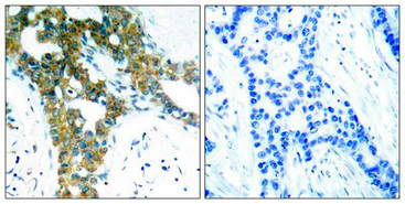 Immunohistochemical analysis of paraffin-embedded human breast carcinoma tissue using PAK1/PAK2/PAK3(Ab-423/402/421) Antibody(left) or the same antibody preincubated with blocking peptide(right).