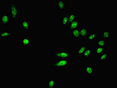 Immunofluorescent analysis of Hela cells using CSB-PA017456LA01HU at dilution of 1:100 and Alexa Fluor 488-congugated AffiniPure Goat Anti-Rabbit IgG(H+L)