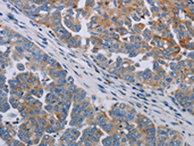 The image on the left is immunohistochemistry of paraffin-embedded Human ovarian cancer tissue using CSB-PA992379(PARP10 Antibody) at dilution 1/30, on the right is treated with synthetic peptide. (Original magnification: ×200)