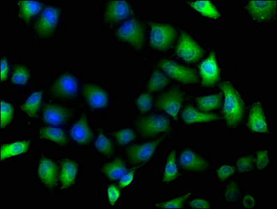 Immunofluorescence staining of Hela cells with CSB-PA847623LA01HU at 1:100, counter-stained with DAPI. The cells were fixed in 4% formaldehyde, permeabilized using 0.2% Triton X-100 and blocked in 10% normal Goat Serum. The cells were then incubated with the antibody overnight at 4°C. The secondary antibody was Alexa Fluor 488-congugated AffiniPure Goat Anti-Rabbit IgG(H+L).