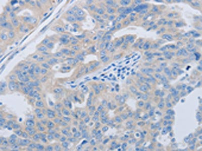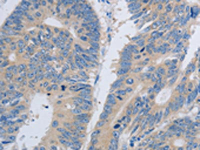 The image on the left is immunohistochemistry of paraffin-embedded Human colon cancer tissue using CSB-PA225945(PAWR Antibody) at dilution 1/60, on the right is treated with synthetic peptide. (Original magnification: ×200)