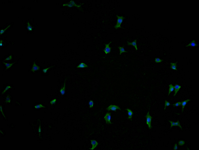 Immunofluorescence staining of SH-SY5Y cells with CSB-PA897505LA11HU at 1:100, counter-stained with DAPI. The cells were fixed in 4% formaldehyde and blocked in 10% normal Goat Serum. The cells were then incubated with the antibody overnight at 4°C. The secondary antibody was Alexa Fluor 488-congugated AffiniPure Goat Anti-Rabbit IgG(H+L).