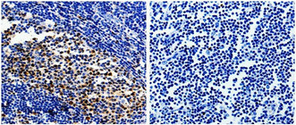 The image on the left is immunohistochemistry of paraffin-embedded Human tonsil tissue using 31002 (PCNA Antibody) at dilution 1/25, on the right is treated with the fusion protein.