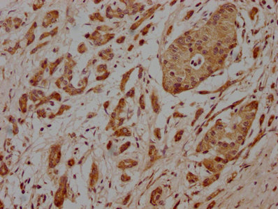 IHC image of CSB-PA614881LA01HU diluted at 1:100 and staining in paraffin-embedded human pancreatic cancer performed on a Leica BondTM system. After dewaxing and hydration, antigen retrieval was mediated by high pressure in a citrate buffer (pH 6.0). Section was blocked with 10% normal goat serum 30min at RT. Then primary antibody (1% BSA) was incubated at 4°C overnight. The primary is detected by a biotinylated secondary antibody and visualized using an HRP conjugated SP system.