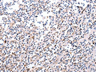 The image on the left is immunohistochemistry of paraffin-embedded Human tonsil tissue using CSB-PA469157(PDCD10 Antibody) at dilution 1/20, on the right is treated with fusion protein. (Original magnification: ×200)