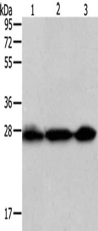 Gel: 12%SDS-PAGE, Lysate: 50 μg, Lane 1-3: Hela cells, Jurkat cells, 231 cells, Primary antibody: CSB-PA469157(PDCD10 Antibody) at dilution 1/200, Secondary antibody: Goat anti rabbit IgG at 1/8000 dilution, Exposure time: 10 seconds