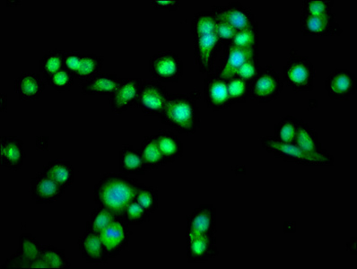 Immunofluorescence staining of PC-3 cells with CSB-PA04874A0Rb at 1:66, counter-stained with DAPI. The cells were fixed in 4% formaldehyde, permeabilized using 0.2% Triton X-100 and blocked in 10% normal Goat Serum. The cells were then incubated with the antibody overnight at 4°C. The secondary antibody was Alexa Fluor 488-congugated AffiniPure Goat Anti-Rabbit IgG(H+L).