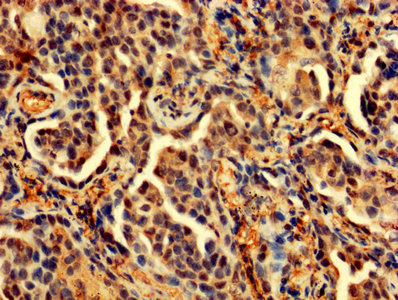 IHC image of CSB-PA04874A0Rb diluted at 1:200 and staining in paraffin-embedded human lung cancer performed on a Leica BondTM system. After dewaxing and hydration, antigen retrieval was mediated by high pressure in a citrate buffer (pH 6.0). Section was blocked with 10% normal goat serum 30min at RT. Then primary antibody (1% BSA) was incubated at 4°C overnight. The primary is detected by a biotinylated secondary antibody and visualized using an HRP conjugated SP system.