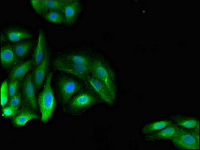 Immunofluorescent analysis of HepG2 cells using CSB-PA875726LA01HU at dilution of 1:100 and Alexa Fluor 488-congugated AffiniPure Goat Anti-Rabbit IgG(H+L)