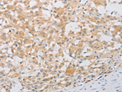 The image on the left is immunohistochemistry of paraffin-embedded Human gastic cancer tissue using CSB-PA048149(PDE4D Antibody) at dilution 1/20, on the right is treated with fusion protein. (Original magnification: ×200)