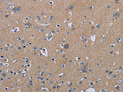 The image on the left is immunohistochemistry of paraffin-embedded Human brain tissue using CSB-PA309418(PDE4D Antibody) at dilution 1/20, on the right is treated with synthetic peptide. (Original magnification: ×200)