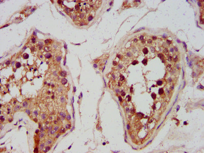IHC image of CSB-PA878946LA01HU diluted at 1:600 and staining in paraffin-embedded human testis tissue performed on a Leica BondTM system. After dewaxing and hydration, antigen retrieval was mediated by high pressure in a citrate buffer (pH 6.0). Section was blocked with 10% normal goat serum 30min at RT. Then primary antibody (1% BSA) was incubated at 4°C overnight. The primary is detected by a biotinylated secondary antibody and visualized using an HRP conjugated SP system.
