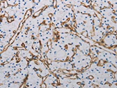 The image on the left is immunohistochemistry of paraffin-embedded Human renal cancer tissue using CSB-PA929097(PECAM1 Antibody) at dilution 1/40, on the right is treated with synthetic peptide. (Original magnification: ×200)