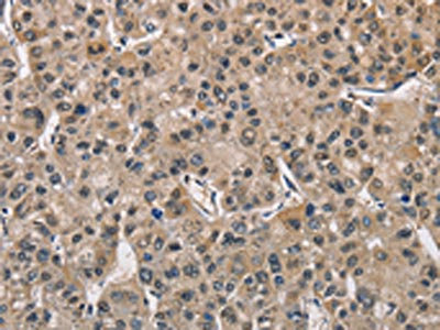 The image on the left is immunohistochemistry of paraffin-embedded Human liver cancer tissue using CSB-PA547426(PGK1 Antibody) at dilution 1/40, on the right is treated with fusion protein. (Original magnification: ×200)