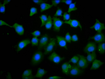 Immunofluorescence staining of A549 cells with CSB-PA017880LA01HU at 1:133, counter-stained with DAPI. The cells were fixed in 4% formaldehyde, permeabilized using 0.2% Triton X-100 and blocked in 10% normal Goat Serum. The cells were then incubated with the antibody overnight at 4°C. The secondary antibody was Alexa Fluor 488-congugated AffiniPure Goat Anti-Rabbit IgG(H+L).