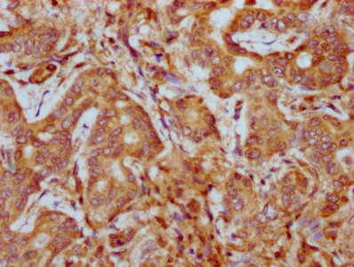 IHC image of CSB-PA017880LA01HU diluted at 1:400 and staining in paraffin-embedded human liver cancer performed on a Leica BondTM system. After dewaxing and hydration, antigen retrieval was mediated by high pressure in a citrate buffer (pH 6.0). Section was blocked with 10% normal goat serum 30min at RT. Then primary antibody (1% BSA) was incubated at 4°C overnight. The primary is detected by a biotinylated secondary antibody and visualized using an HRP conjugated SP system.