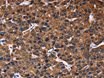 The image on the left is immunohistochemistry of paraffin-embedded Human liver cancer tissue using CSB-PA926901(PHB Antibody) at dilution 1/30, on the right is treated with fusion protein. (Original magnification: ×200)
