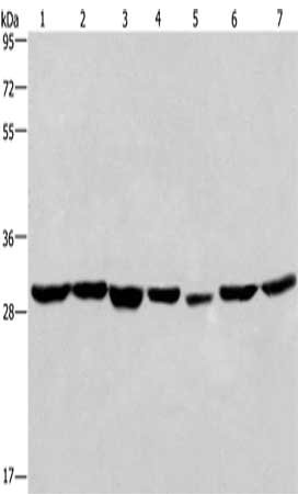 Gel: 10%SDS-PAGE, Lysate: 40 μg, Lane 1-7: 293T cells, A549 cells, human liver cancer tissue, PC3 cells, human placenta tissue, hela cells, mouse heart tissue, Primary antibody: CSB-PA926901(PHB Antibody) at dilution 1/350, Secondary antibody: Goat anti rabbit IgG at 1/8000 dilution, Exposure time: 15 seconds