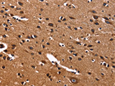 The image on the left is immunohistochemistry of paraffin-embedded Human brain tissue using CSB-PA014587(PHB Antibody) at dilution 1/40, on the right is treated with fusion protein. (Original magnification: ×200)