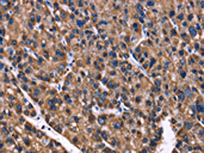 The image on the left is immunohistochemistry of paraffin-embedded Human liver cancer tissue using CSB-PA014587(PHB Antibody) at dilution 1/40, on the right is treated with fusion protein. (Original magnification: ×200)