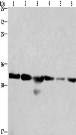 Gel: 10%SDS-PAGE, Lysate: 40 μg, Lane 1-6: 293T cells, A549 cells, human hepatocellular carcinoma tissue, PC3 cells, hela cells, mouse heart tissue, Primary antibody: CSB-PA014587(PHB Antibody) at dilution 1/500, Secondary antibody: Goat anti rabbit IgG at 1/8000 dilution, Exposure time: 15 seconds