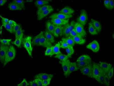 Immunofluorescence staining of HepG2 cells with CSB-PA017896LA01HU at 1:133, counter-stained with DAPI. The cells were fixed in 4% formaldehyde, permeabilized using 0.2% Triton X-100 and blocked in 10% normal Goat Serum. The cells were then incubated with the antibody overnight at 4°C. The secondary antibody was Alexa Fluor 488-congugated AffiniPure Goat Anti-Rabbit IgG(H+L).