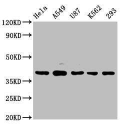 Positive WB detected in: Hela whole cell lysate, A549 whole cell lysate, U87 whole cell lysate, K562 whole cell lysate, 293 whole cell lysate